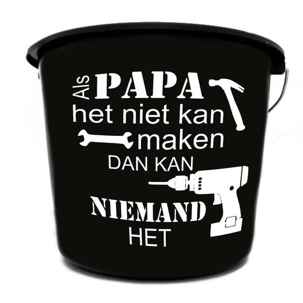 Stoere klusemmer voor opa. Met de tekst; als opa het niet kan maken dan kan niemand het. Deze emmer kunnen we natuurlijk ook maken voor een handige papa.